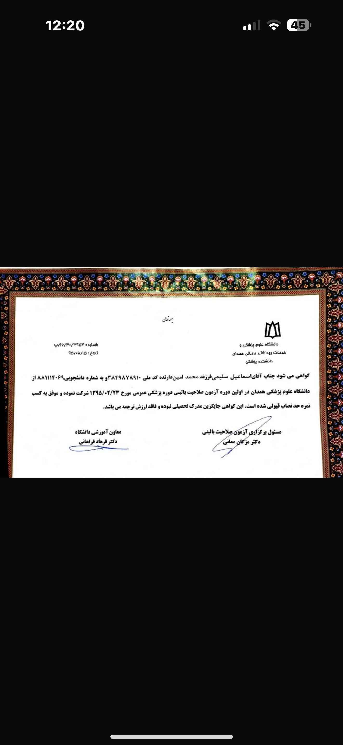 كواهى مى شود جناب آفاى اسماعيل سليمى فرزند محمد أمين دارنده كد على ٣٨٢٩٨٧٨٩١٠و به شماره دانشجوبى ٩ع٨٨١١١٢٠ از دانشكاه علوم بزشكى همدان در اولين دوره آزمون صلاحيت بالينى دوره يزشكى عمومى مورخ ١٣٩٥/٠٢/٢٣ شركت نموده و موفق به كسب نمره حد نصاب قبولى شده است، ابن كواهى جايكزين مدرى تحصيلى نبوده و فاقد ارزش ترجمه مى باشد.