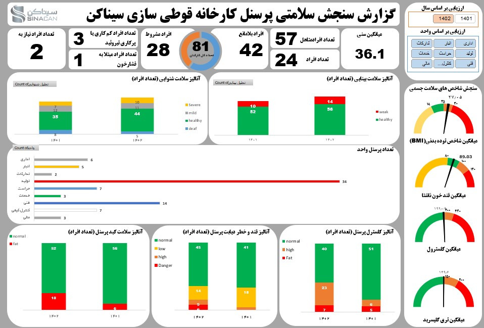 این پروژه مختص واحد HSE کارخانه میباشد که در آن کاربر ابتدا اطلاعات شناسنامه ای افراد و همچنین آزمایشهای دورهای پرسنل را وارد کرده و خروجی را به صورت : تحلیل میانگین شاخصهای سلامتی (قند و کلسترول و ...) در میان کل پرسنل و همچنین کارنامه سلامت فردی پرسنل بر اساس مقایسه وضعیت سلامتی بر اساس آزمایشهای دوره ای و در نهایت افراد در معرض خطرات سلامتی از جمله خطر شنوایی، بینایی، کبد چرب و غیره نمایش میدهد و به کاربر HSE یک وضعیت کلی و جزئی از سلامت پرسنل ارائه میدهد.